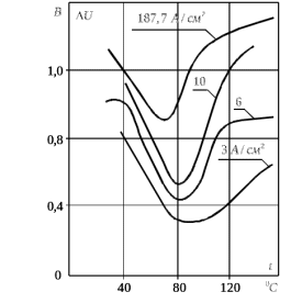 - при дальнейшем увеличении температуры падение напряжения начинало возрастать, что особенно заметно при относительно больших значениях