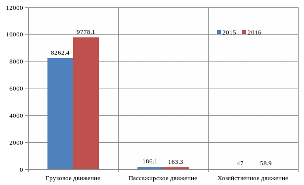 За 12 месяцев 2016 года объем перевозок к аналогичному периоду прошлого года увеличен на 6,4 % и составил 111843,8 млн.т.км.бр. против 105162,9 млн.т.км.бр., в том числе рост отмечен в грузовом движении на 6,4 % по отношению к аналогичному периоду 2015 года и составил 108861,3 млн.т.км.бр. против 102292,9 млн.т.км.бр., в хозяйственном движении рост составил 36,8 % по отношению к аналогичному периоду 2015 года и составил 1011,2 млн.т.км.бр. против 739,3 млн.т.км.бр. Распределние показателей объемов перевозок по видам движения предоставлено в таблице 3.1.