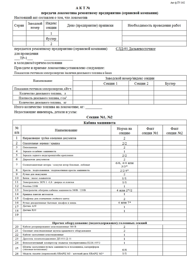 В случае постановки локомотива в ожидание проведения ТО-2 в акте формы ТУ-162 ЭТД разделы с данными о недостающем инвентаре не заполняются.