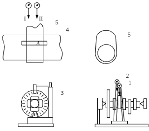 На штативах для каждого вида измерений устанавливается две соответствующие индикаторные головки в плоскостях I и II. Для каждого кулачкового вала последовательно выполняются отмеченные выше два вида измерений.