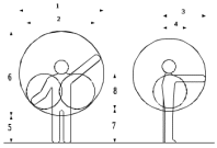 Рисунок 6.1 – Зоны досягаемости оператора в плоскостях при положении стоя: 1,5,6,7 – зона для размещения редко используемых органов управления (зона досягаемости моторного поля); 2,8 – зона для размещения часто используемых органов управления (зона легкой досягаемости моторного поля); 3,4 – зона для размещения очень часто используемых органов управления (оптимальная зона моторного поля)