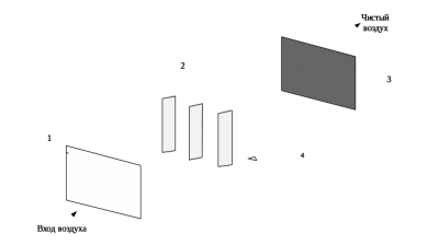 На рисунке 4.4 представлена модель фильтра для охлаждения тяговых машин. Первым слоем (1) в такой системе очистки представляет собой сетку, который задерживает более крупные частицы. Вторым слоем (2) очистки воздуха служит жалюзийный фильтр, который имеет желоб (4) для удаления грязи и пыли. Третьим слоем находится сеточный фильтр (3), более мелкого сечения.