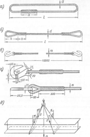 Универсальный строп имеет широкое применение и используется для захвата большинства конструктивных элементов. Кроме универсального стропа, применяются облегченные стропы, имеющие на концах петли или крюки (рис. 3.7, б, в, г). Во избежание перетирания отдельных проволочек в петли вставляют коуши. Наиболее распространены стропы из тросов диаметром от 11 до 30 мм.