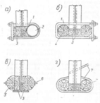 Рисунок 3.6 – Усиление решетчатых конструкций при монтаже: а - стальными трубами; б, г - бревнами; в - пластинами: 1 - скоба; 2 - сальная труба; 3 - прокладки; 4 - бревна; 5 - пластины; 6 - стяжной болт; 7- прутья катанки.