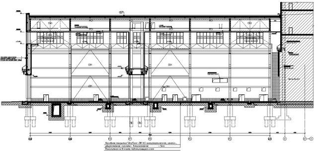 Несущий основной каркас цеха, обеспечивающий жесткость корпуса в поперечном и продольном направлении, являются поперечные рамы с колоннами, защемленные в фундаменте и с жестким сопряжением стропильных ферм с колоннами. Продольная устойчивость корпуса обеспечивается вертикальными связями по колоннам. Подкрановые балки приняты неразрезными. Совместно с неразрезными тормозными площадками, горизонтальными связями по нижним поясам балок и вертикальными фермами образован жесткий «неразрезной» подкрановый блок.