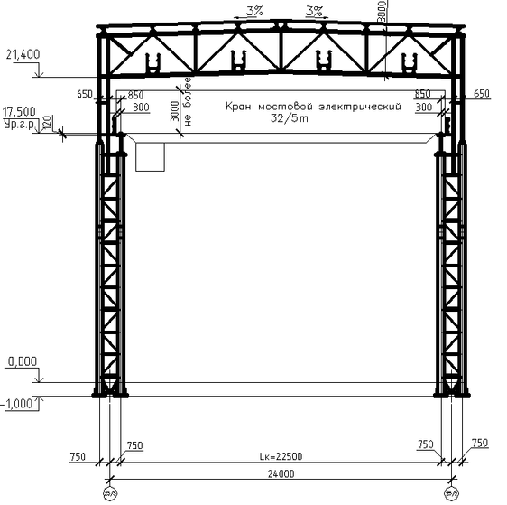 Здание в осях 25/2-23/3 и Я/12-Я - однопролетное производственное, пролетом 24,0 м, длиной 72,0 м, шаг колонн 12м. Несущим каркасом здания являются поперечные рамы, состоящие из колонн и ферм. Шаг поперечных рам составляет 12,0 м. В здании на отм. +17,500 устанавливаются два мостовых крана грузоподъемностью 32/5 т.