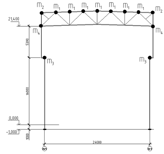 Расчет поперечной рамы выполняется в программном комплексе SCAD office. Расчет выполняется для основной рамы с максимальной грузовой площадью. Расчет рамы выполняется на постоянные, крановые, сейсмические и атмосферные нагрузки. Результаты расчета программного комплекса SCAD office в приложении.Расчетная схема стропильной конструкции загружена 5 видами нагрузок (постоянная, крановая, снеговая, ветровая и сейсмическая). Перечень нагрузок приведен в таблице 2.3. Виды расчетных комбинаций нагрузок приведены в таблице 2.4.