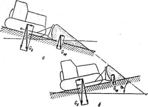 а- под уклон; б- на подъем; G6, Gпр- соответственно силы тяжести бульдозера и тела волочения;