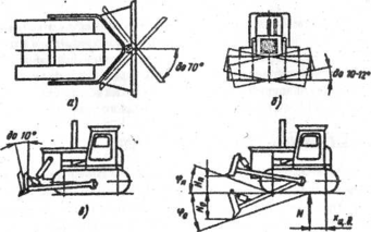 При выполнении земляных работ на пересеченной местности эффективность применения бульдозеров существенно зависит от возможности установки отвала с перекосом в вертикальной плоскости, а также от того, насколько может быть поднят или опущен отвал (рисунок 2, б, г). Обычно угол перекоса для отвала принимают не более 12 .Это позволяет установить один из концов отвала примерно на 30 см выше другого. При работе на косогоре, в этом случае облегчается разработка грунта и сооружение горизонтального полотна дороги, террасы и т. п.