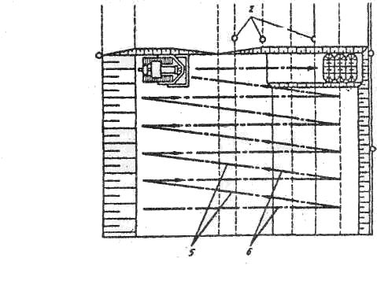 Ступенчатую схему разработки и перемещения грунта применяют в основном при сооружении насыпей и планировке наклонных площадей, а также выполнении вскрышных работ. В этом случае бульдозер разрабатывает, транспортирует и укладывает грунт в насыпь 4, перемещаясь по параллельным прямолинейным траекториям 1 и 6, нормальным к оси сооружения. Обратное движение 5 бульдозера на участок разработки грунта осуществляется задним ходом машины под углом к этим траекториям.