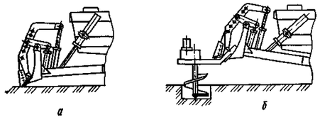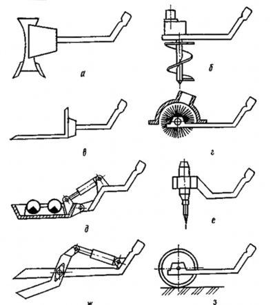а – обратный отвал, б – буровой рабочий орган, в – вилочный захват,