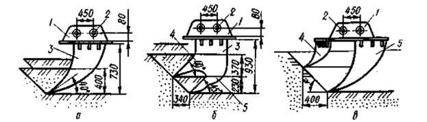 а – зуб-рыхлитель, б, в – рыхлители с зубьями соответственно сомкнутыми и разнесенными; 1 – проушины; 2 – монтажные отверстия; 3 – стойка; 4, 5 – зубья соответственно передний и задний.