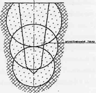 Физико-механические свойства уплотнённого грунта существенно изменяются: более благоприятной становится его микроструктура, повышается несущая способность, устраняется просадочность и снижается склонность к влагопоглощению. Если образованный в грунте котлован несколько раз засыпается грунтом и повторно протрамбовывается, то в грунтовом массиве окончательно образуется тело уплотнения, показанное на рисунок 2.2. Диаметр подобного тела в 2-3 раза превышает средний диаметр оболочки.