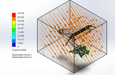 Для этих режимов в модуле «Flow Simulation» задана внешняя среда – воздух, атмосферное давление и температура нормальных условий, а также скорость встречного и бокового потоков, воздействующие на токоприемник со скоростью 110 км/ч, что соответствует движению электровоза на высоких (конструкционных) скоростях и наличию встречного ветра ураганной силы.