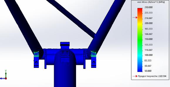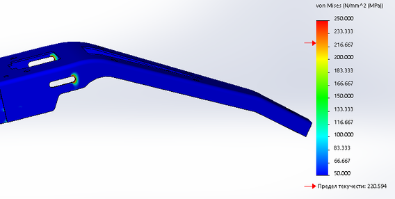 Результаты расчёта усилия от ветрового потока, как уже было сказано ранее, перенесены в модуль «Simulation», посредством экспорта. Помимо этого, добавлена вертикально-действующая на полоз сила, равная 450 Н и закрепления. Это больше установленной нормы силы, действующей от контактного провода в нормальных условиях, но представляет особый интерес для исследований, с целью получения критических результатов. На рисунке 3.1 изображена эпюра ветрового потока.