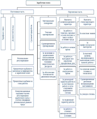 Заработная плата состоит из основной части, носящий постоянный характер, и дополнительной, имеющей переменный характер. Основная часть включает в себя тарифную ставку и должностной оклад. Переменная часть представляет собой различные виды премий, доплат и надбавок.