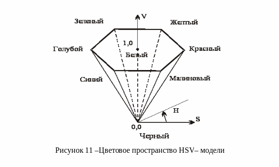 Процесс добавления белого цвета к заданному можно представить как уменьшение насыщенности S, а процесс добавления чёрного цвета – как уменьшение яркости V. Основанию шестигранного конуса соответствует проекция RGB куба вдоль его главной диагонали (Рис. 11).