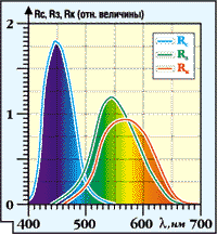 В основе любой колориметрической системы находятся цветности триады, так как от них результаты измерений зависят в особенно большой степени. Это видно из кривых основных возбуждений (рисунок 9)[34].