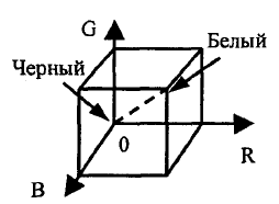аще всего данную модель представляют в виде единичного куба с ортами: (1;0;0)- красный, (0;1;0)- зеленый, (0;0;1)- синий и началом (0;0;0)- черный.