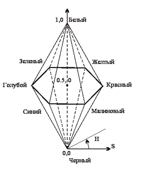 Еще одним примером системы, построенной на интуитивных понятиях тона насыщенности и яркости, является система HLS (Hue, Lightness, Saturation). Здесь множество всех цветов представляет собой два шестигранных конуса, поставленных друг на друга (основание к основанию) (Рисунок 12). В таких системах параметры имеют интуитивно понятный смысл и в основном используются для ручного задания цвета.
