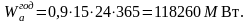 Чтобы оценить данную мощность нужно выделить из неё активную составляющую. Из условий эксплуатации существующей ЛЭП принимается коэффициент пересчёта равный 0,9. Тогда годовая активная энергия определится по формуле, МВт