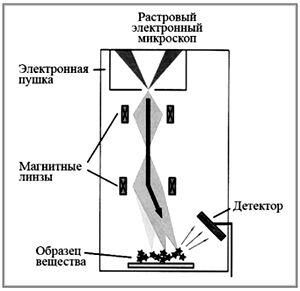 В отличие от просвечивающих, сканирующие электронные микроскопы (СЭМ) (рисунок 3.3), (рисунок 3.4) строят изображение внешней поверхности образца, сканируя ее с помощью электронного луча, сжатого магнитными линзами до размера порядка 5 нм. После взаимодействия луча с поверхностью электроны рассеиваются и попадают на детектор, регистрирующий сигнал и преобразующий его в изображение поверхности. Интенсивность сигнала зависит от рельефа поверхности, размера частиц и их химического состава. Все это можно определять с помощью сканирующего электронного микроскопа.