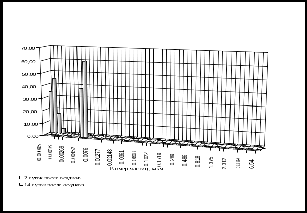 Средний диаметр частиц через двое суток после осадков 4,63 нм. Средний диаметр частиц через четырнадцать суток после осадков 1,04 нм. (рисунок 5.1).