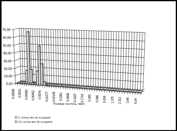 Средний диаметр частиц через двое суток после осадков 5,13 нм. Средний диаметр частиц через четырнадцать суток после осадков 1,76 нм. (рисунок 5.2).