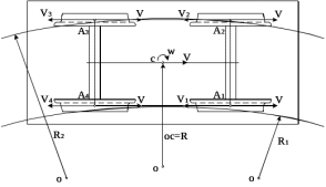 Известно, что движение тележки в круговой кривой с сохранением хордового положения и с постоянной угловой скоростью может происходить без касания наружного рельса гребнем набегающего колеса. При этом сила давления гребня на рельс минимальна, что является положительным фактором. Однако, при ходовой установке тележки в кривой существуют две причины появления неуравновешенных составляющих касательных сил в точках контакта колес, способствующих разворачиванию тележки вокруг оси