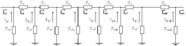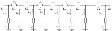 Рисунок 1.17 - Схема замещения заземляемых конструкций, присоединенных к рельсу двухниточной рельсовой рельсовой цепи, при пробитом искровом промежутке на четвертой опоре. Длина пролета 60 м.