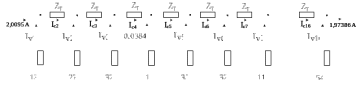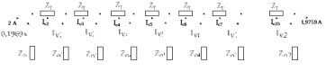Для рассмотрения влияния заземленных конструкций на основные режимы работы рельсовых цепей, рассмотрим блок – участок пути, ограниченный сигнальными точками №6 и №8, перегона Арга – Серышево, на рисунке. (1.20) представлена его схема замещения заземляемых конструкций, присоединенных к рельсу двухниточной рельсовой цепи. Длина рельсовой цепи составляет 2300 м. На рассматриваемом блок – участке установлено 40 железобетонных опор контактной сети, длина пролетов равна 60 м. Опоры заземлены на тяговый рельс стальным заземляющим спуском диаметром 10 мм. Опоры имеют в цепи заземления искровые промежутки типа ИП -3. Рельсовая цепь питается от преобразователя частоты ПЧ – 50/25 мощностью 100 В∙А, вторичная обмотка секционирована, что позволяет регулировать напряжение частотой 25Гц в пределах от 0 до 175 В, с градацией 5В на выводах «н» и «к», сигнальный ток, вырабатываемый источником питания составляет 2,2 А.