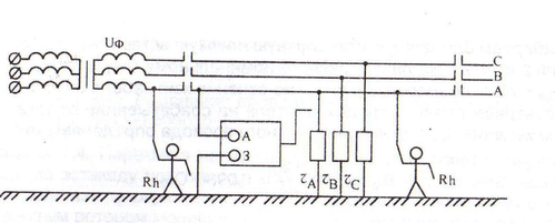 Произведем расчет величины тока проходящего через тело человека. На рисунке 6.1 приведена схема измерения сопротивления изоляции сети.[14]