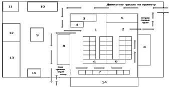 Рис. 2.5 Схема грузового терминала: 1-склад прибытия; 2-склад убытия; 3-помещение персонала; 4-склад ценных грузов; 5-склад временного хранения; 6-теплый склад; 7-комплектовочная линия; 8-эстакада; 9-весовая; 10-охлаждаемые помещения; 11-склад опасных грузов; 12-АКЗС; 13-гараж.