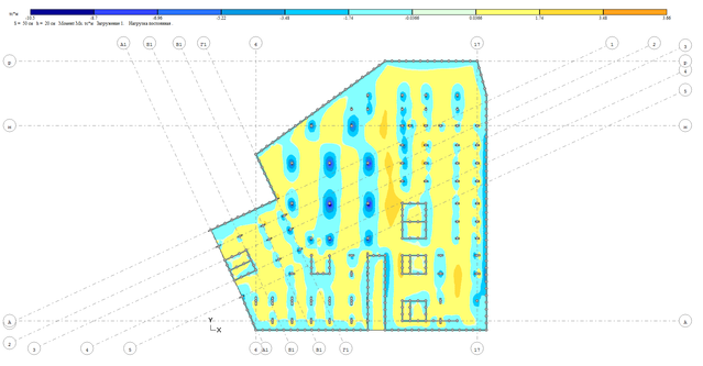 | Этаж N1 Фундаментная плита N1 b=0.6м, S=1416.01м2, 1. Железобетон, C1Min=200тс/м3, C1Max=200тс/м3, C1Ave=200тс/м3, C2Min=2000тс/м2, C2Max=2000тс/м2, C2Ave=2000.004тс/м2 | |||||||