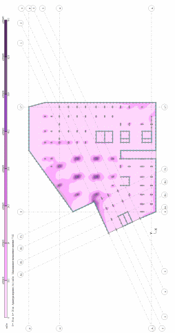 Построение изополей выполняется только для расчетного армирования. Цветовая шкала дает представление о величине площади армирования в точках плиты. В графическом и цифровом виде может быть показана как расчетная, так и остаточная площадь арматуры. Команды доступны при выбранном виде армирования — у верхней грани плиты, у нижней грани плиты или поперечном. Значения продольной арматуры приведены в см2 на 1 погонный метр сечения плиты, поперечной — в см2 на 1 погонный метр сечения плиты при расчетном шаге 1 метр.