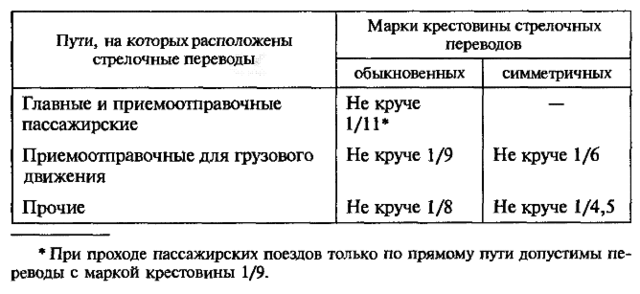 Стрелочные переводы на главных путях и приёмо-отправных путях пассажирского движения имеют крестовины не круче 1/11; стрелочным переводам по которому пассажирские поезда движутся только по прямому пути перевода, как правило не допускается иметь марку крестовины 1/9 и круче (радиусы их переводных кривых довольно близки к значениям 300 и 200 м соответственно). На приёмо-отправных путях грузового движения укладывают стрелочные переводы с маркой крестовины не круче 1/9, а симметричные – не круче 1/6. Стрелочные переводы прочих путей имеют марки крестовин не круче 1/8, а симметричные не круче 1/4,5.
