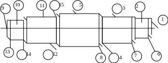Поверхность 5 является исходной для заготовки. Поверхности 7,14 служат упором от смещения оси в горизонтальной плоскости. На всех поверхностях сняты фаски. На поверхностях 2,10 сделаны лыски для устновки оси в пазухи рамы.