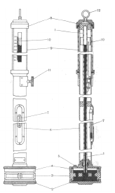 1 –– стеклянная трубка; 2 –– дно чашки; 3 –– диафрагма чашки; 4 –– крышка чашки; 5 — винт; 6 — металлическая оправа; 7 –– ртутный термометр; 8 — крышка; 9 –– стеклянная трубка; 10 –– нониус, 11 — кремальера; 12 –– кольцо