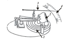 1 –– металлическая коробка; 2 –– полосовая пружина; 3 –– стрелка;4 –– шкала