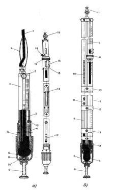 а) барометр контрольный КР (вид и разрез): 1, 2 — стеклянные трубки;3 — баллон; 4 — стальной конус; 5 — чашка; 6 — мешок; 7 — колпачок; 8 — стакан; 9 –– винт; 10— пятка винта; 11 ––оправа; 12 —пластина нулевого индекса; 13 — винт; 14 –– термометр; 15 — муфта;16— нониус; 17 — микрометренное кольцо; 18 –– стопорный винт; 19–– подвес;