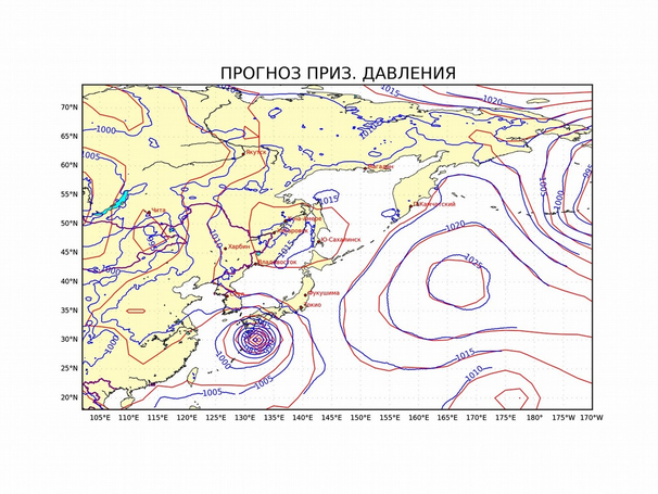 В сравнении с данными Европейского метеорологического центра изображенными на рисунке 3.4 и рисунок 3.5, точность барометрической формулы не велика и использовать её в качестве эталонного значения для метеорологических карт не благоразумно. Но данный метод выигрывает у все остальные методов по скорости получения данных.