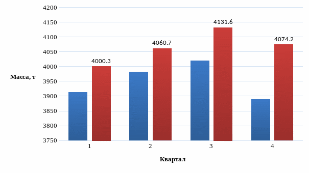 Из результатов представленной диаграммы (рисунок 1.1) видно, что по сравнению с 2015 г., расход электроэнергии на тягу поездов в 2016 г. в среднем значительно увеличилось (особенно фиксируется разница в затратах в 4 квартале), но также и увеличилась средняя масса провозимых грузов (таблица 1.2, рисунок 1.2).
