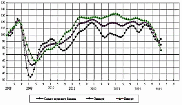 Падение объемов экспорта началось в июне 2014 года, причем темпы снижения объемов экспорта увеличивались от месяца к месяцу, наибольшие их значения пришлись на декабрь 2014 года, а в январе – феврале 2015 года падение экспорта замедлилось. Относительно предыдущего месяца стоимостные объемы экспорта сокращались с 0,3% в июне 2014 года до 5,6% в декабре 2014 года, в январе – феврале 2015 года – соответственно на 5,1% и 3,4% [41].
