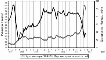 Рисунок 2.2 Динамика среднемесячного курса доллара США на российском внутреннем валютном рынке (рублей за 1 доллар США) и цен мирового рынка на нефть марки Urals (долларов за 1 баррель) [6]