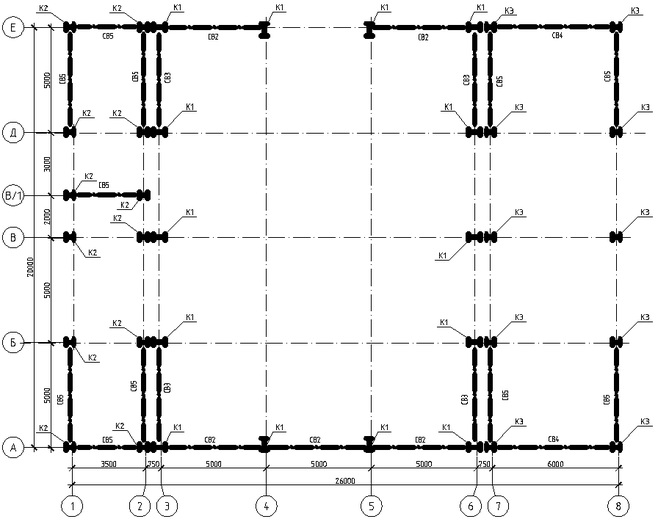 Общая устойчивость каркаса обеспечивается системой горизонтальных и вертикальных связей, а так же жестким диском перекрытия.которые объединяют все элементы в единый пространственный блок.