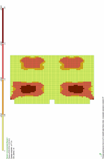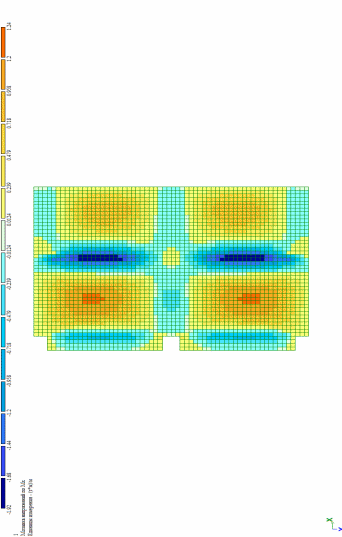 Как видно из рисунка, плита перекрытия, состоящая из конечных элементов в виде оболочки размером 0,3*0,3 м разбивается на отдельные плиты со своими пластическими шарнирами. При полосовой нагрузка картина формирования пластических шарниров иная.