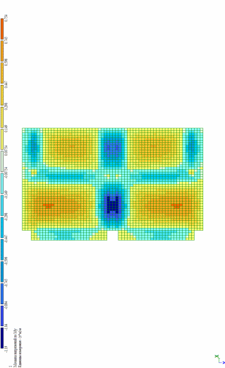 Плита перекрытия моделировалась конечным элементом №41 (оболочка). Закрепления узлов в месте опирания монолитной плиты перекрытия на кирпичную стену. Шаг разбивки узлов конечно-элементной схемы – 0,3x0,3м.