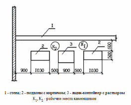 Общую ширину рабочих мест принимают равной 2.5 – 2.6 м, в том числе рабочую зону 60 – 70 см. Рабочее место и расположение материалов звена каменщиков на подмостях представлены на рисунке 3.