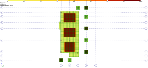 Закрепление узлов фундаментной плиты и столбчатых фундаментов производилось по X, Y, UZ. Коэффициенты постели варьировались в пределах от 800 до 1000 т/м3