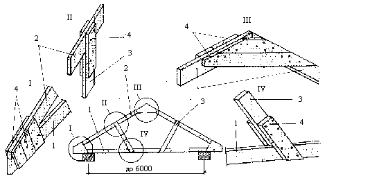Рисунок 3.4 – Безврубочные сопряжения дощатых стропил: I - узел сопряжения с затяжкой; II - сопряжение подкоса со стропильной ногой; III - стропильных ног в коньке; IV - подкоса с затяжкой; 1 - затяжка; 2 - стропильная нога; 3 - подкос; 4 – накладки.